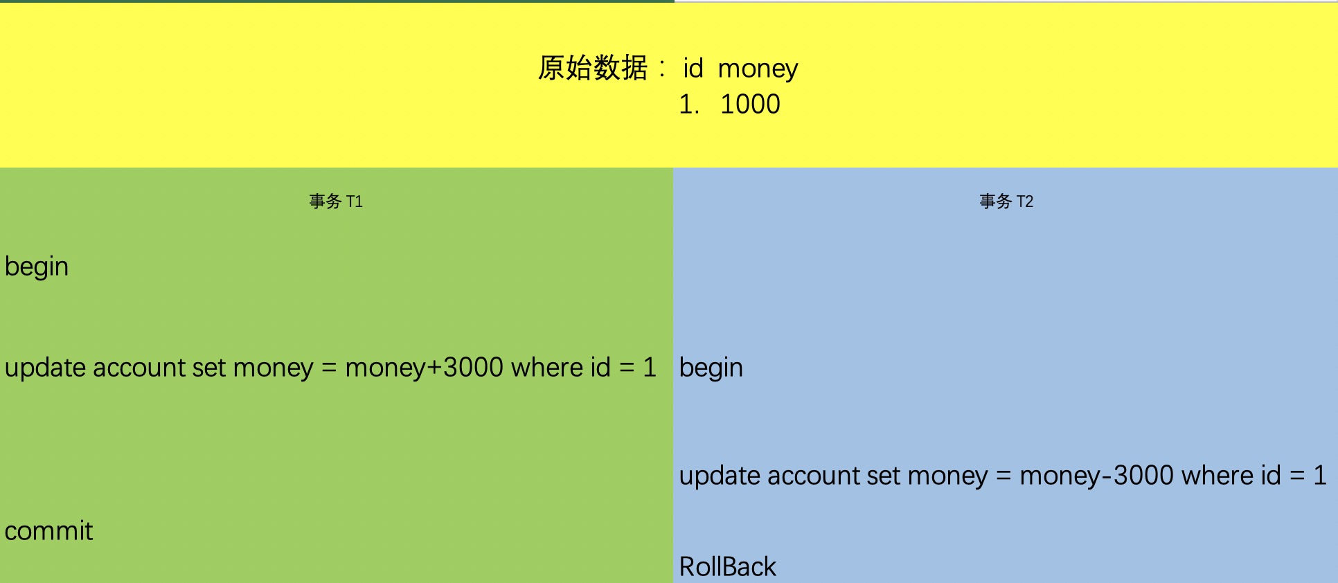 当事务 T1 先更新数据,T2 读到的数据是 T1 更新后的数据,但之后,T1 竟然回滚了,那么 T2 原本读到的数据实际上就不准确了。(T1 做了个假动作虚晃一枪)