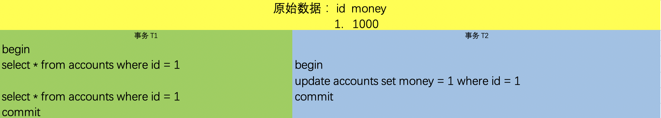 在事务 T1 执行到第四行select * from accounts where id = 1的时候,得到的值是 T2 更新后的值,就称之为不可重复读。而可重复读的情况是,在一个事务内,第一次读到的结果和第二次,第三次,第四次…第 N 次 读到的结果应该是一致的,只要他们都属于同一个事务而且未结束。