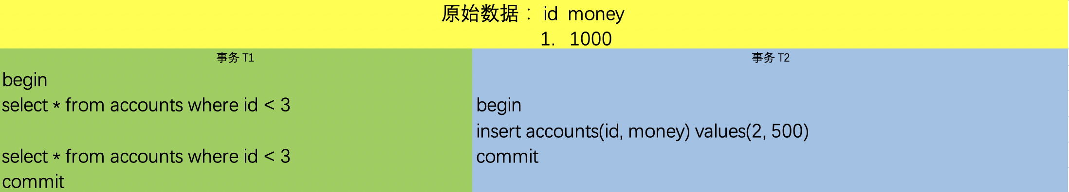 在第二次范围查询 accounts 表的时候,另一个事务插入了一条符合条件的数据,导致第一次查询的结果(返回 1 )和第二次返回的查询结果(返回 2)产生了不一致,就称之为幻读。而不产生幻读的情况是什么呢?在一个事务内,第一次查询的结果和第二次,第三次,… 第 N 次 的结果一致,只要他们都属于同一个事务而且未结束。
